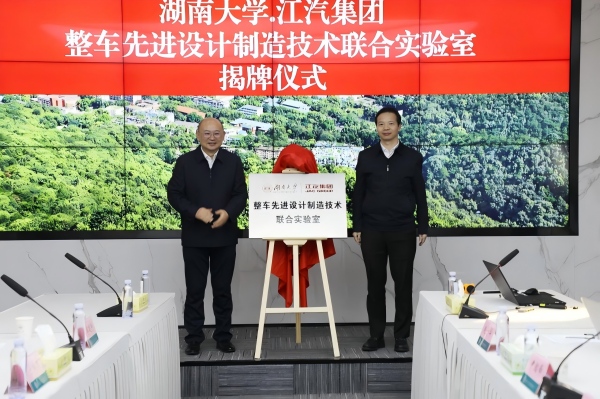 近日,湖南大学与安徽江淮汽车集团股份有限公司(以下简称“江汽集团”)共同建设的“湖南大学-江汽集团整车先进设计制造技术联合实验室”揭牌仪式暨双方座谈交流会,在湖南大学整车先进设计制造技术全国重点实验室成功举行。江汽集团党委书记、董事长项兴初,湖南大学副校长李肯立出席仪式并致辞,江汽集团副总经理、技术中心主任宋华,湖南大学整车先进设计制造技术全国重点实验室主任徐世伟等双方代表共同见证。