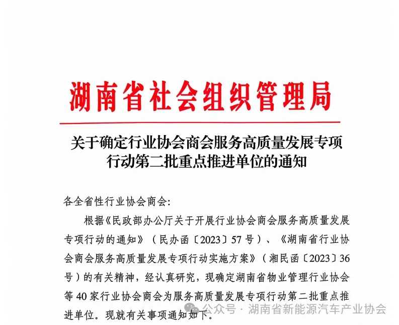2024年8月,湖南省新能源汽车产业协会被确定为湖南省民政厅社管局“服务高质量发展专项行动第二批重点推进单位”。