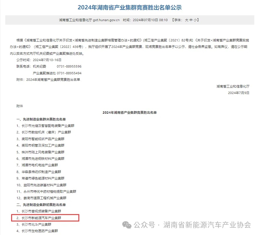 2024年7月10日,湖南省工信厅官网公示了2024年湖南省产业集群竞赛胜出名单,由长沙雨花经开区作为核心承载园区、长沙经开区作为协同承载园区、省新能源汽车产业协会作为集群促进组织的长沙市新能源汽车产业集群,在2024年湖南省先进制造业集群竞赛(初赛)中胜出。
