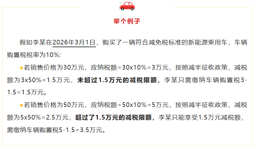 对购置日期在2026年1月1日至2027年12月31日期间的新能源汽车减半征收车辆购置税。其中,每辆新能源乘用车减税额不超过1.5万元。