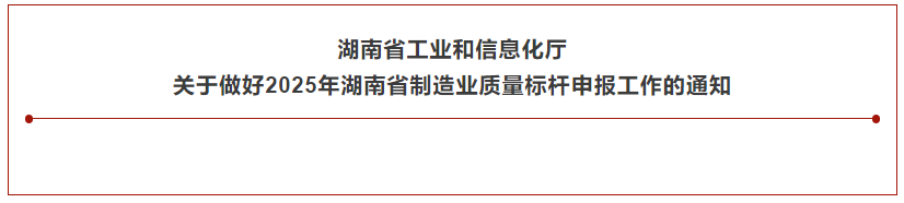 为贯彻落实《工业和信息化部关于做好2025年工业和信息化质量工作的通知》(工信厅科函〔2025〕161号)有关精神,根据《湖南省制造业质量品牌标杆(示范)企业认定管理办法》(湘工信科技〔2022〕273号)有关要求,现就做好2025年“湖南省制造业质量标杆”申报有关事项通知如下: